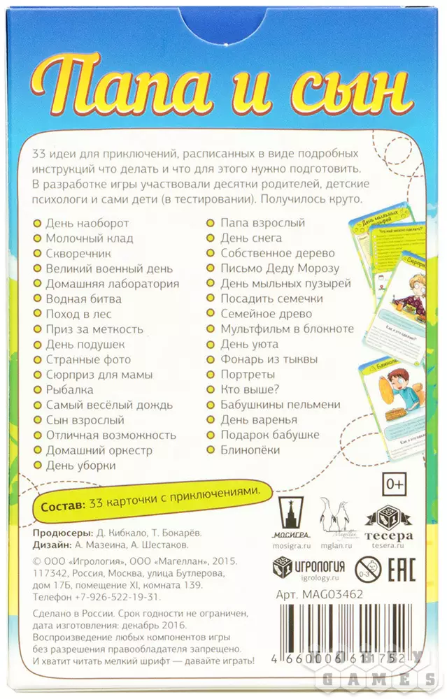 Фраза "отцы и дети" стала крылатой и обычно ассоциируется с конфликтом поколений, но настольная игра "33 приключения" изменит такой подход. Отныне папа и сын станут лучшими друзьями, которые вместе справились с 33 интереснейшими заданиями!