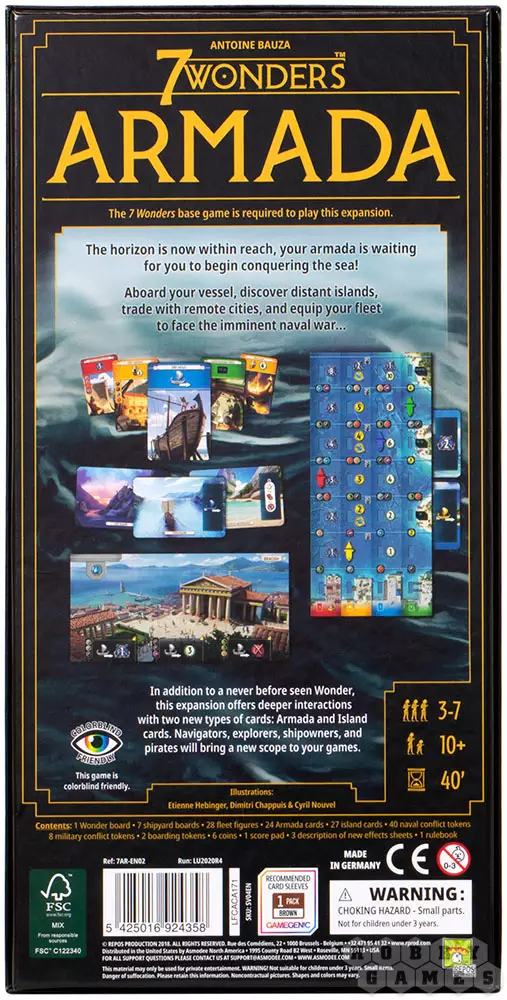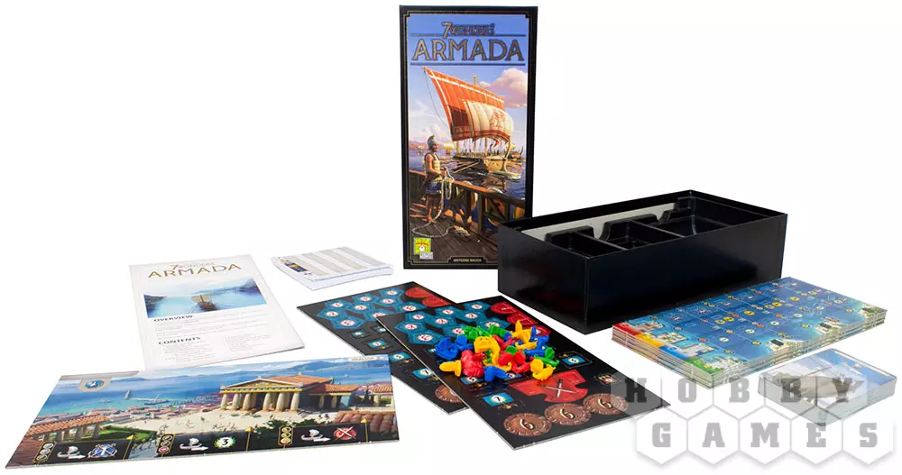 7 Wonders: Armada ("7 Чудес: Армада") – это крупное дополнение для настольной игры "7 Чудес", которое можно сочетать с другими дополнениями в любой комбинации. Каждый игрок получит специальное морское поле в дополнение к своей доске чудес. Также внутри вы найдёте новые красные, зелёные, жёлтые и синие карты для замешивания в колоду. Каждый раз, играя карты этих цветов, вы дополнительно можете заплатить стоимость, указанную на вашем морском поле, чтобы продвинуть корабль соответствующего цвета вверх по треку, получая особые бонусы. Приведите свою нацию к победе на морях вместе дополнением Armada!