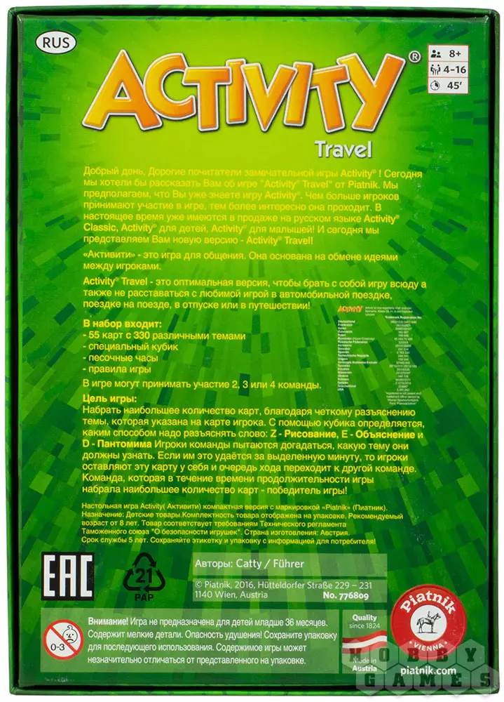Activity Travel – это оптимальная версия популярной игры, которою легко взять с собой, куда бы вы ни пошли. Теперь можно не расставаться с любимой игрой в путешествии на автомобиле, поездке на поезде, или в отпуске! В игре могут принимать участие 2, 3 или 4 команды.