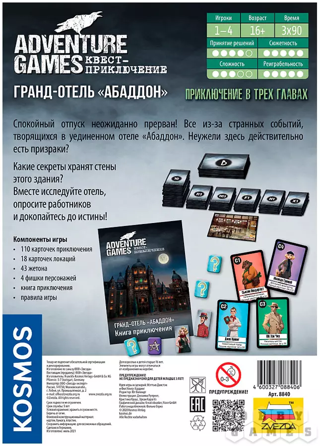 Старинный отель, призраки, тёмные коридоры, тесные номера, ковры, в которых ноги будто бы вязнут... Классическая локация для хоррора, неважно, в формате фильма, игры или книги. Теперь вам предстоит расследовать жуткие тайны старой гостиницы и её призраков и в новой части серии настольных квестов Adventure Games.