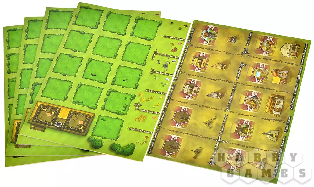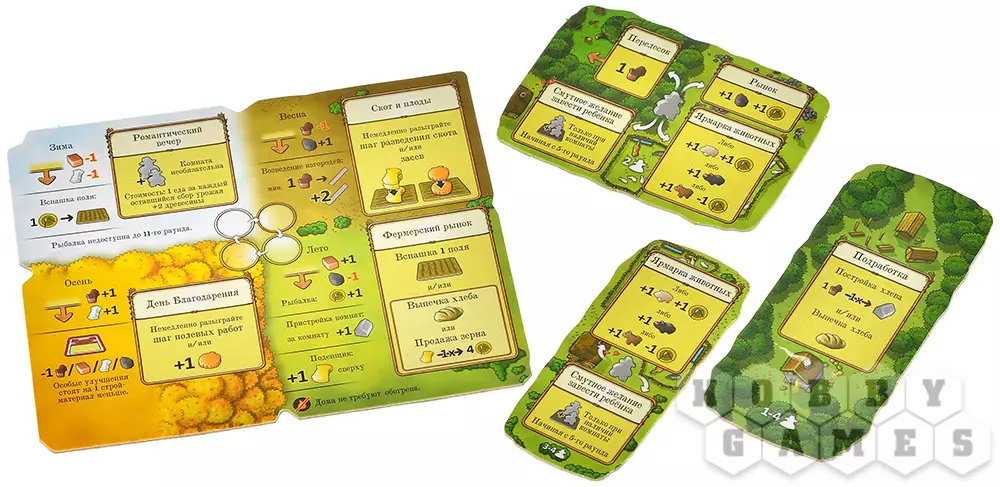 В некоторых раундах затем наступает дополнительный этап сбора урожая – особенная, тревожно-радостная часть игры. Сначала вы собираете по одной фишке посевного материала с каждого засеянного поля. Затем кормите семью; если еды не хватает, приходится брать жетоны попрошайничества. Завершает эту фазу разведение животных: имея хотя бы двух животных одного вида и свободное место, вы получаете одно новое. Урожай случается не в каждом раунде, но он всегда становится проверкой того, насколько мудро вы управляете хозяйством.
