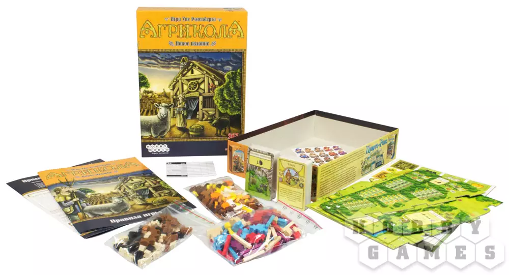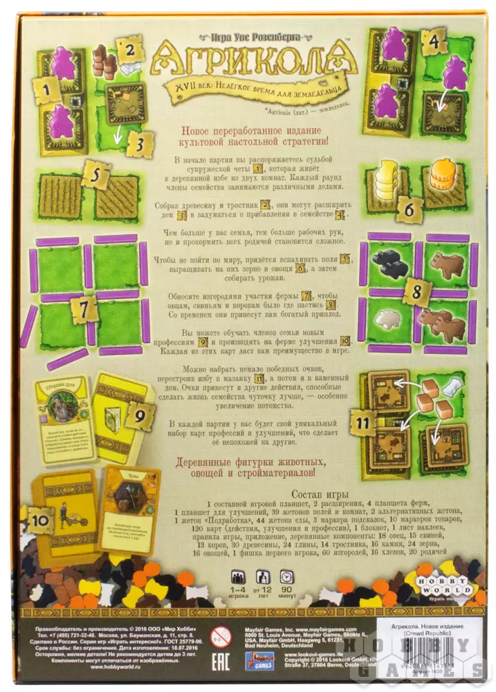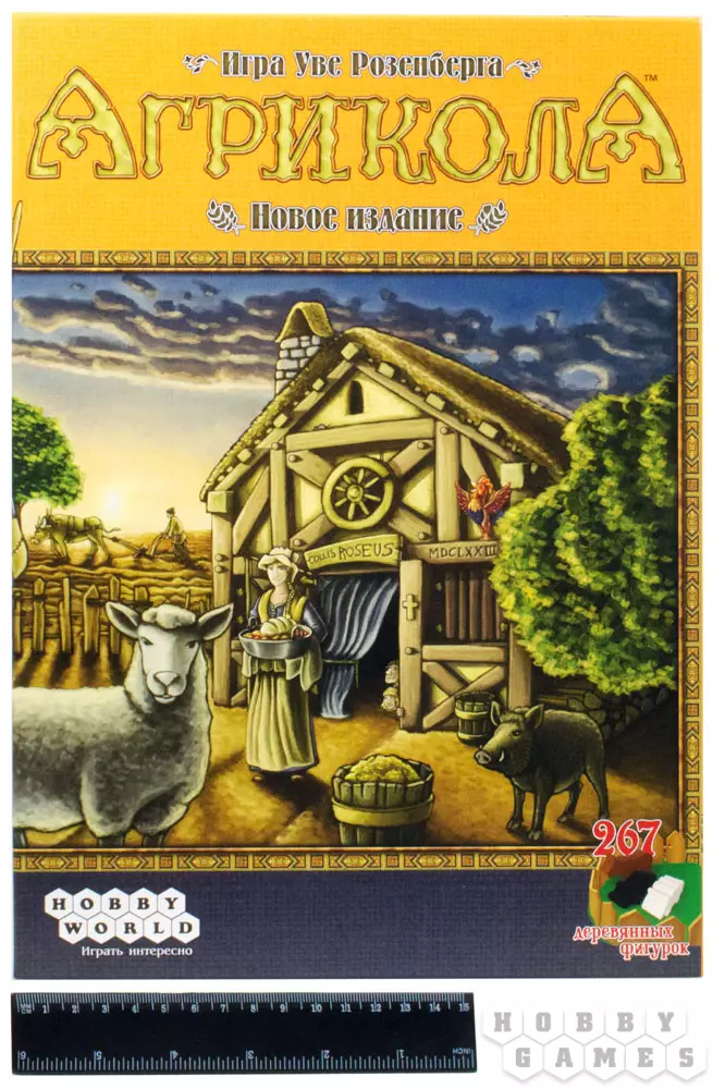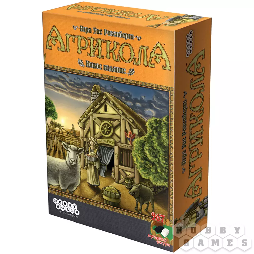Перед вами настольная стратегическая игра "Агрикола", которая по праву считается одной из лучших семейных игр за всю историю настолок! Долгое время она занимала лидирующие позиции в мировых рейтингах настольных игр, также она обладает более чем тридцатью (подумайте только!) почётными наградами. Это уже второе издание игры, которое немного отличается от оригинала 2007 года: количество карт снизилось с 360 до 120, карты стартовых действий заменили на игровые планшеты, максимальное количество игроков стало равняться четырём, изменился дизайн, а игровые ресурсы в виде пшеницы, овощей, дерева, кирпича и камня получили новую форму. После этой работы над ошибками, на выходе мы получаем улучшенную и доработанную версию всеми любимой "Агриколы". Давайте разберёмся, что же это за игра.