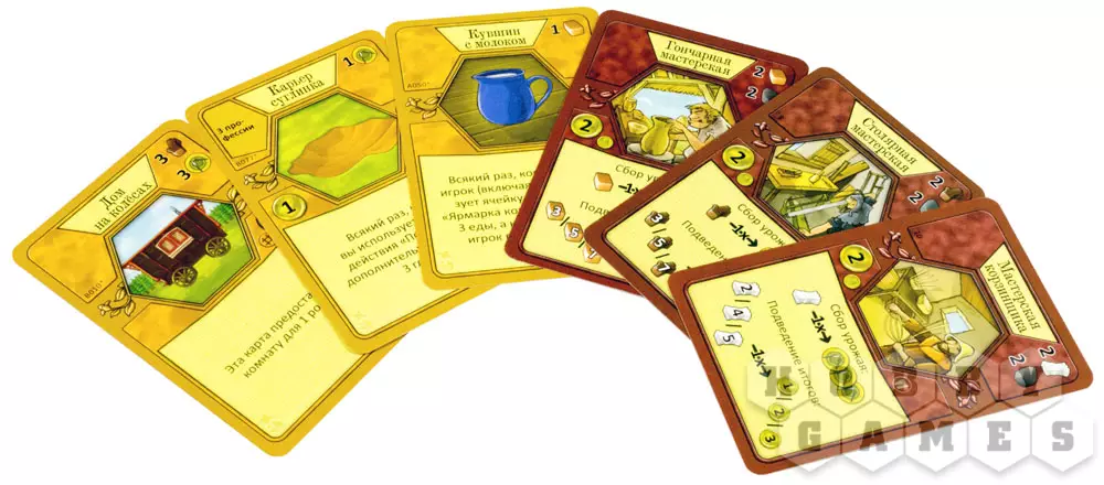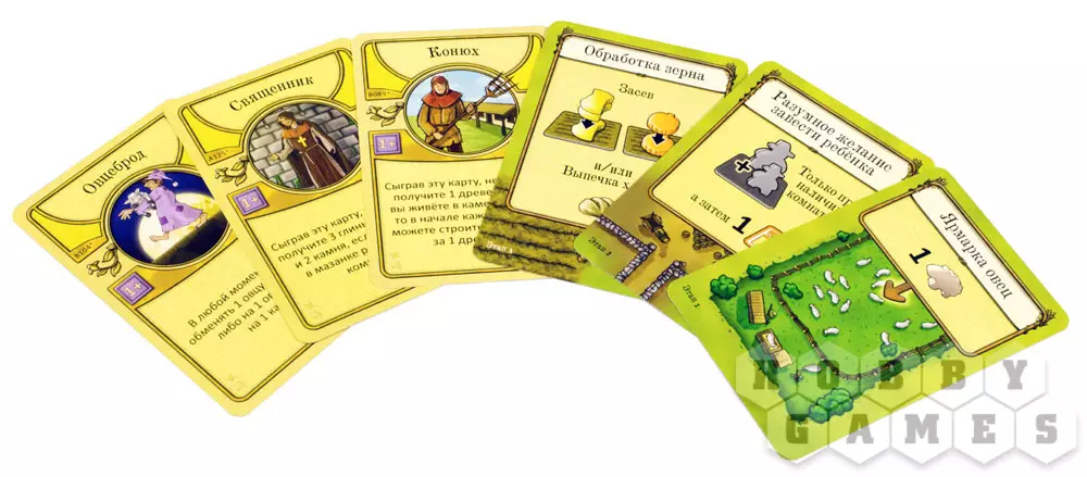 В процессе игры ваше фермерское хозяйство будет расти, вы обзаведётесь животными, на вспаханных полях вырастут зерно и овощи, ваш дом станет больше и сможет вмещать новых членов семьи, которых также придётся кормить. С другой стороны, чем больше ваша семья, тем больше дел по хозяйству вы сможете выполнить! Семью необходимо накормить в конце раунда, который заканчивается Урожаем. Таких раундов в игре шесть. Во время этой фазы все игроки собирают урожай с полей, увеличивают поголовье своего скота и кормят членов своей семьи.