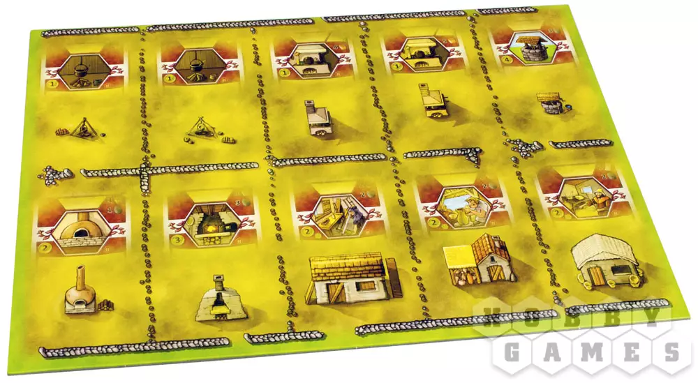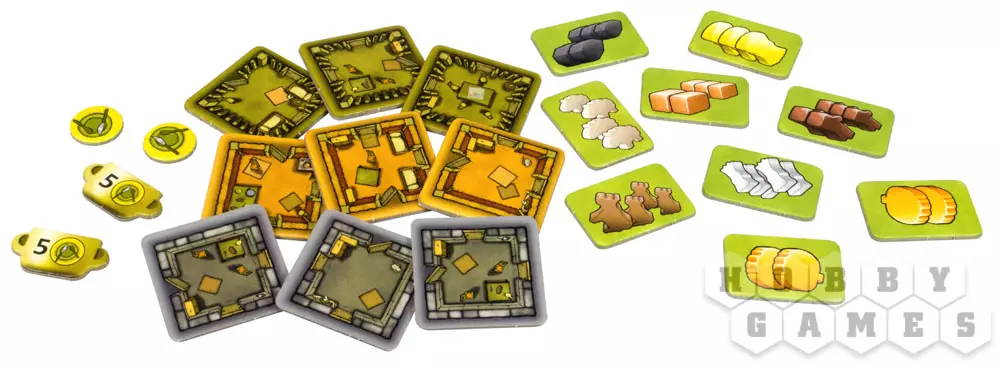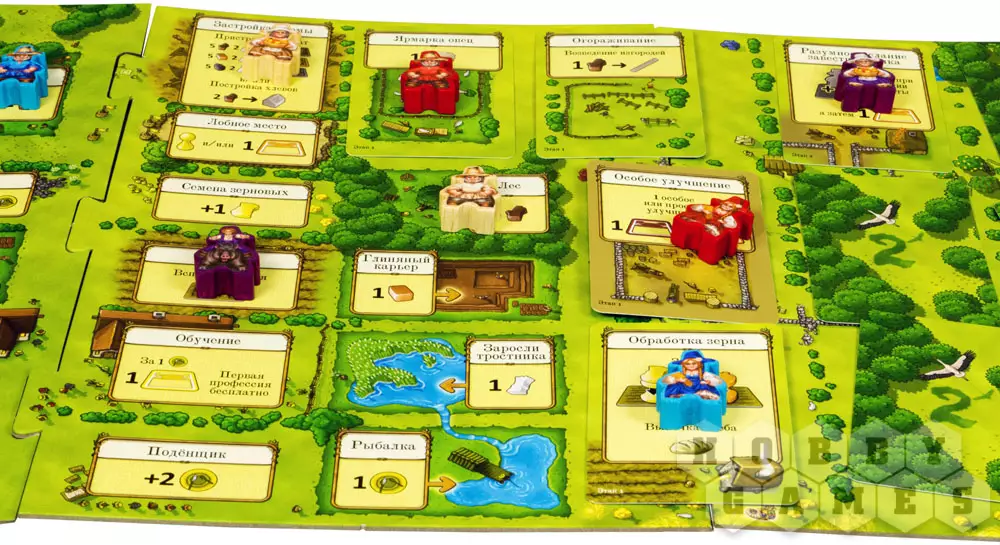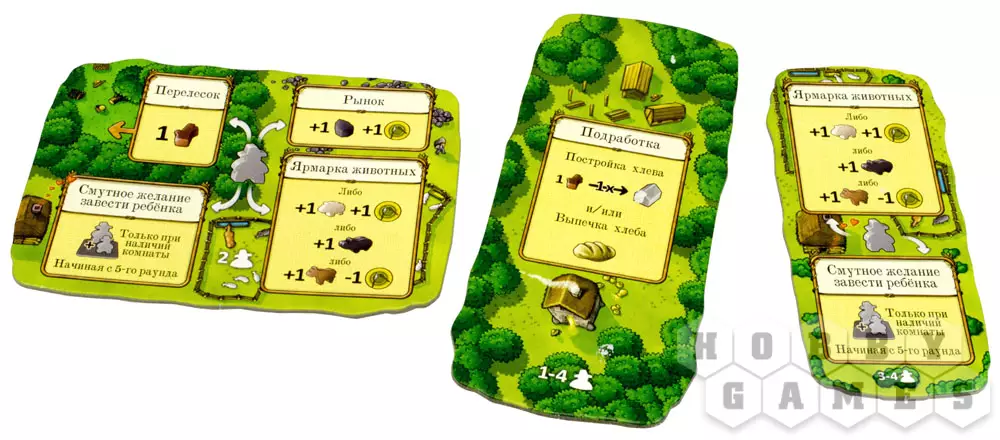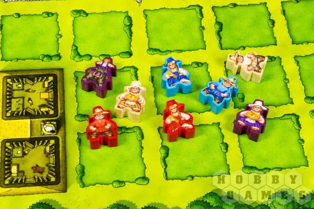 На начало партии семейство каждого игрока насчитывает двоих человек, с помощью которых и предстоит развивать фермерский участок, представленный в игре специальным планшетом. Планшет представляет вам пространство 5х3 блока, а изначально из них занято лишь два – это ваш дом.