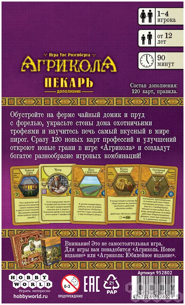 "Агрикола: Пекарь" – это дополнение к "Агриколе", которое привносит в базовую игру 120 новых карт профессий и улучшений. Теперь ваши заботы выходят за пределы полей и загонов: обустройство чайного домика, разведение форели в собственном пруду и охота ради трофеев становятся такими же важными задачами, как посев зерна или разведение скота.