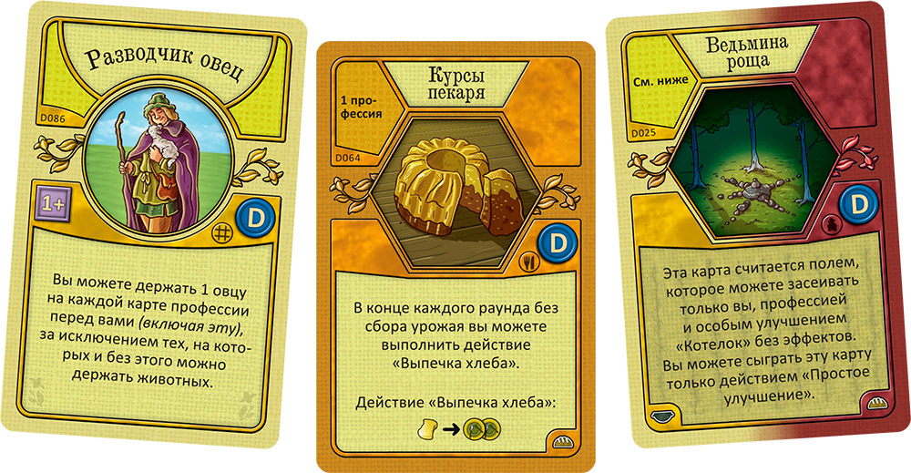 В процессе игры ваше фермерское хозяйство будет расти, вы обзаведётесь животными, на вспаханных полях вырастут зерно и овощи, ваш дом станет больше и сможет вмещать новых членов семьи, которых также придётся кормить. С другой стороны, чем больше ваша семья, тем больше дел по хозяйству вы сможете выполнить! Семью необходимо накормить в конце раунда, который заканчивается Урожаем. Таких раундов в игре шесть. Во время этой фазы все игроки собирают урожай с полей, увеличивают поголовье своего скота и кормят членов своей семьи.