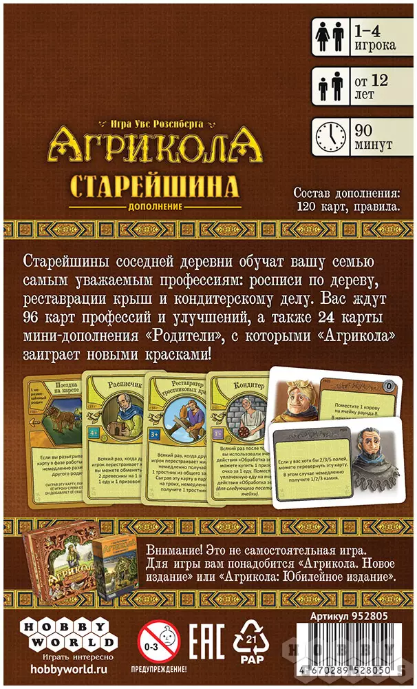 "Агрикола: Старейшина" – это дополнение, которое привносит в игру дух наставничества и преемственности. Вас ждут 96 новых карт профессий и улучшений, открывающих доступ к уважаемым ремёслам: росписи по дереву, реставрации крыш и кондитерскому делу. Эти навыки не только украшают фермерский быт, но и дают свежие стратегические возможности для развития хозяйства.