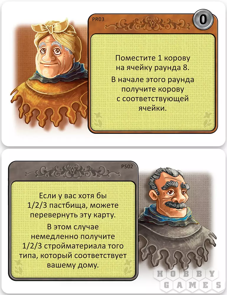 В процессе игры ваше фермерское хозяйство будет расти, вы обзаведётесь животными, на вспаханных полях вырастут зерно и овощи, ваш дом станет больше и сможет вмещать новых членов семьи, которых также придётся кормить. С другой стороны, чем больше ваша семья, тем больше дел по хозяйству вы сможете выполнить! Семью необходимо накормить в конце раунда, который заканчивается Урожаем. Таких раундов в игре шесть. Во время этой фазы все игроки собирают урожай с полей, увеличивают поголовье своего скота и кормят членов своей семьи.