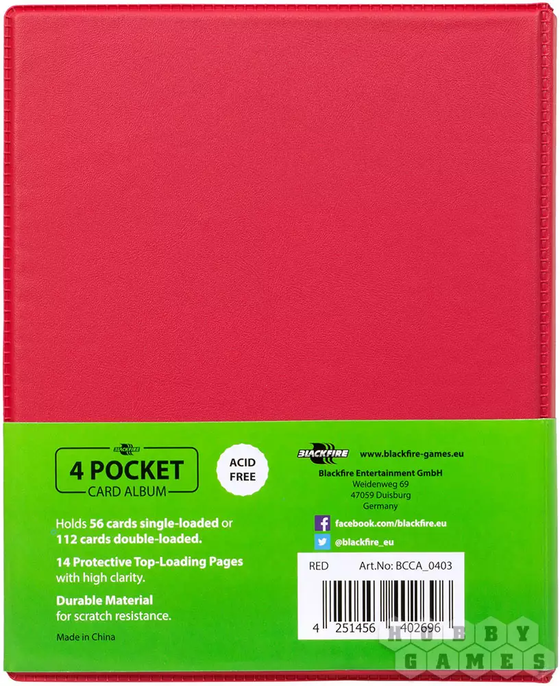 Защитите ваши карты от внешних воздействий! В этом альбоме красного цвета 14 встроенных листов, по 4 кармашка с верхней загрузкой карт на каждом. Всего в альбоме помещается 56 карт при одинарной загрузке или же 112 карт при двойной. Листы сделаны из прочного материала, не царапающего карты. А твёрдая обложка защитит как ваши карты, так и сам альбом.