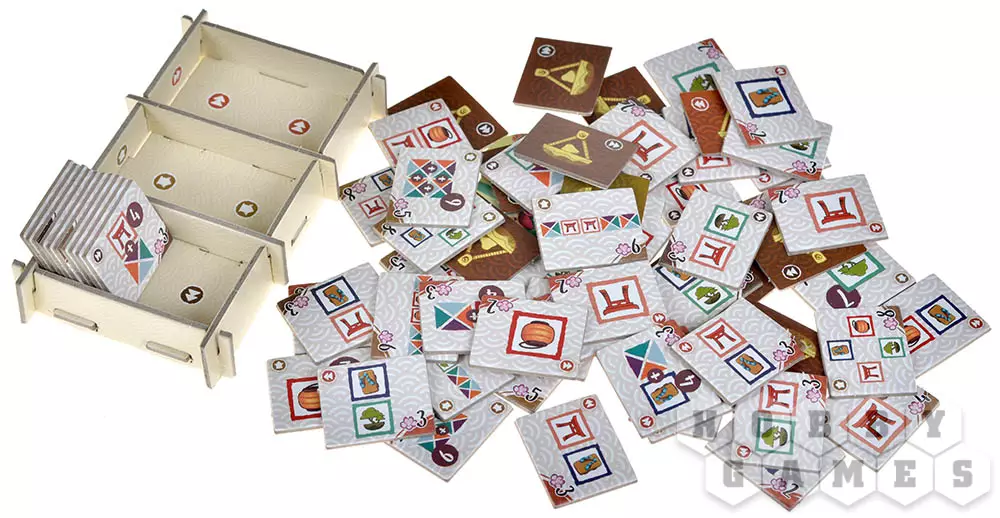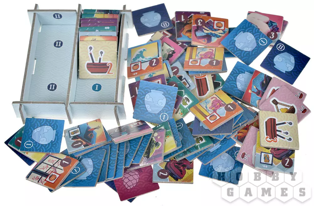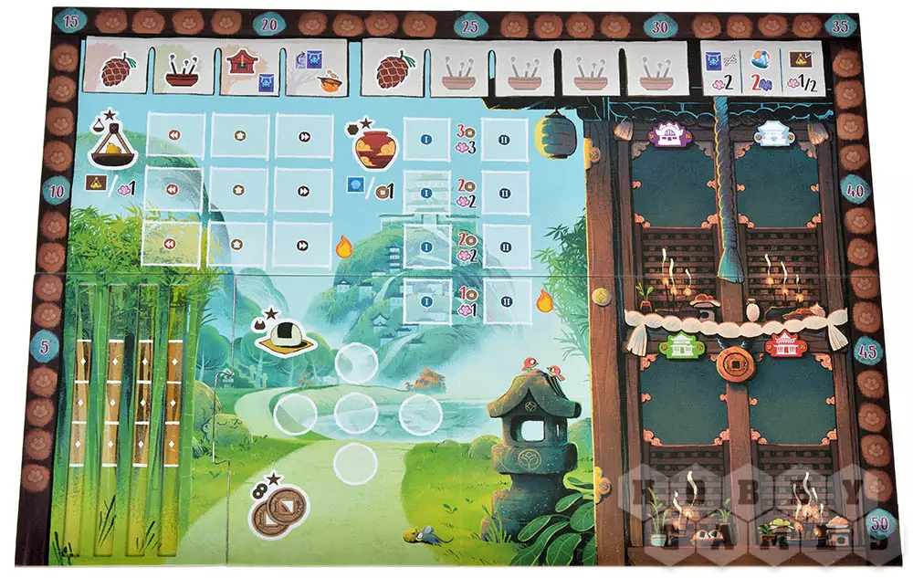 Подготовьте игровое поле: присоедините к его левой нижней части деталь с прорезями, в которые в случайном порядке поместите 12 фишек ростков бамбука с символом . Затем выложите из общего запаса 5 случайных жетонов еды в центр игрового поля, а жетоны гармонии и жетоны дома разделите на несколько стопок по символам. Перемешайте жетоны духов, разделите их на 4 стопки по 4 жетона и поместите каждую в один из четырёх храмов на игровом поле. Игроки получают личный планшет дома, все компоненты своего цвета, один случайный жетон гармонии, 4 фишки ростков бамбука разных цветов и 3 монеты. Можем начинать!