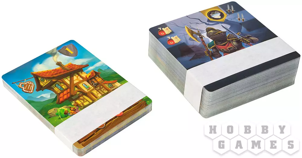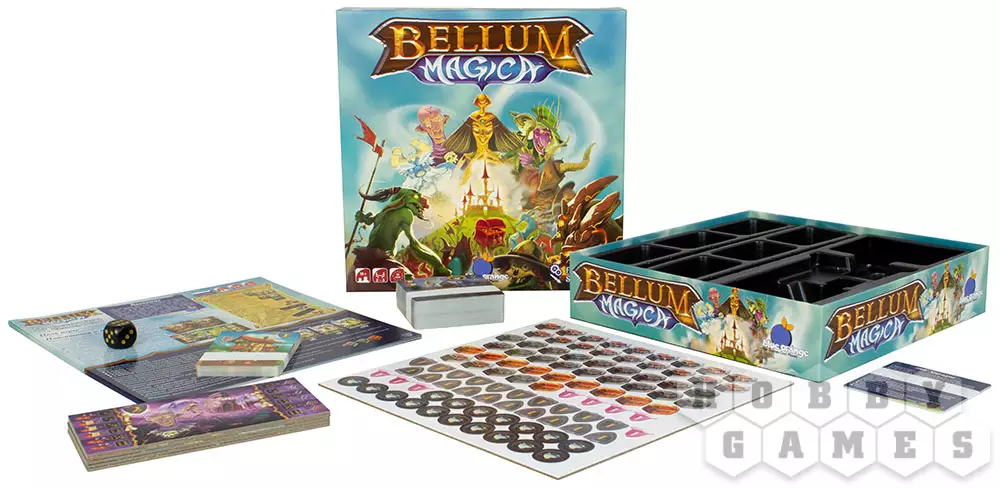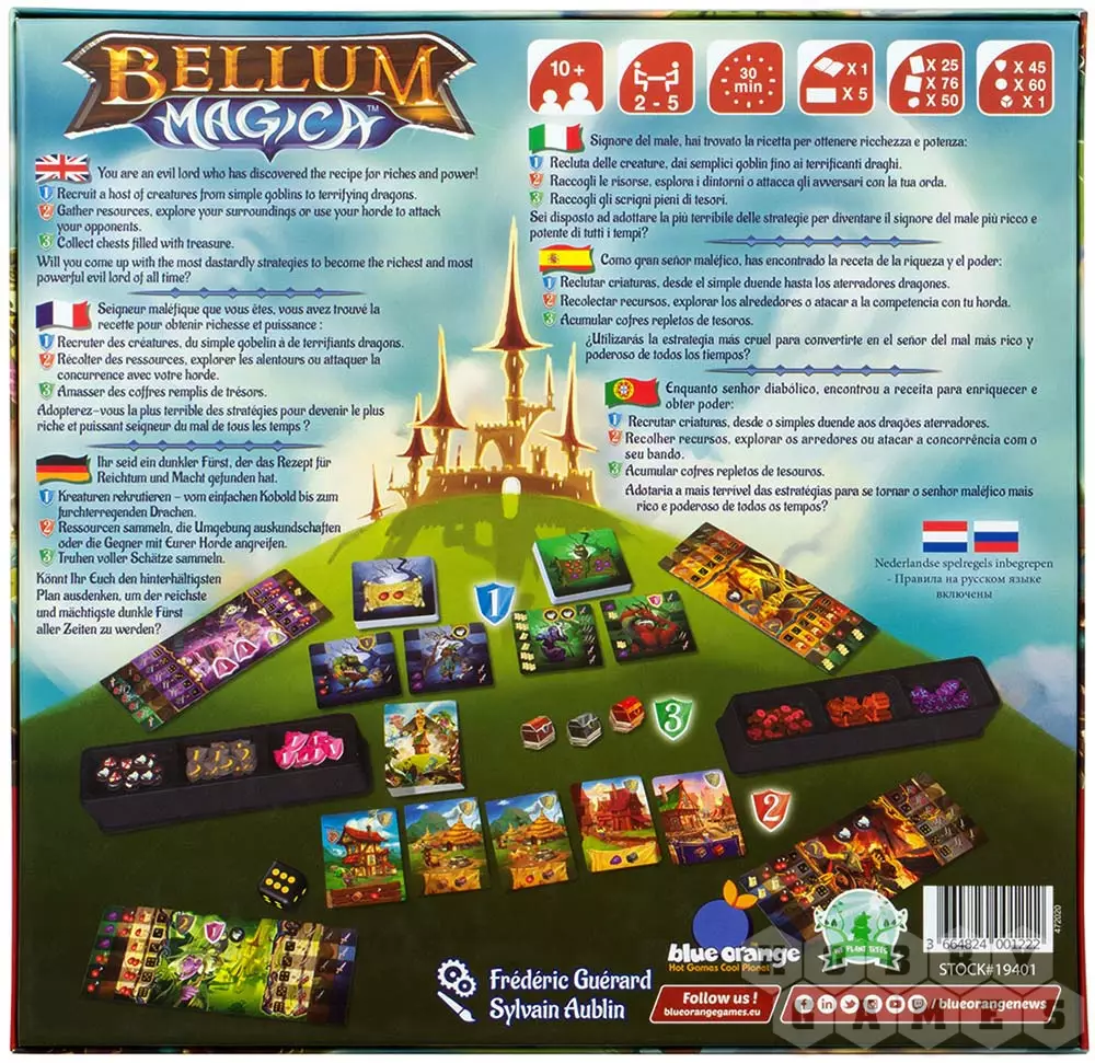 Настольная игра Bellum Magica – это простая стратегическая карточная игра, в которой каждый из игроков берёт на себя роль Тёмного владыки. У вас есть свой замок и орда злобных существ, которая каждый раунд будет приносить ресурсы и атаковать деревни жителей, а также, если вы пожелаете, может напасть на замок другого игрока. Цель игры проста: вы должны награбить как можно больше сундуков с сокровищами. В начале игры всем раздаются по 2 карты гоблинов, у каждой из которых есть по 2 способности: слева добыча ресурсов, справа – атака и оборона. Вы должны расположить полученные карты по бокам от своего замка в зависимости от того, какие способности гоблинов вы хотите использовать. Далее броском кубика определяется, какая орда будет активна в текущем раунде. После этого все игроки ходят по очереди: сначала собираются ресурсы, затем подсчитываются собранные разведчиками карты с сокровищами – у кого из игроков больше, тот получает сундук. Затем в порядке очереди все игроки предпринимают по одной атаке: либо напасть на деревню, либо на другого игрока. После атаки игроки могут нанять новых существ в свою армию (за ресурсы само собой). Игра заканчивается, когда один из игроков собирает 10 сундуков. Но это вовсе не значит, что он победил; ценность у всех сундуков разная, она указана на обратной стороне жетона, которая закрыта от остальных игроков (кроме вас). Вы подсчитываете именно ценность. У кого получилась сумма больше всех, тот и становится самым богатым Тёмным лордом!