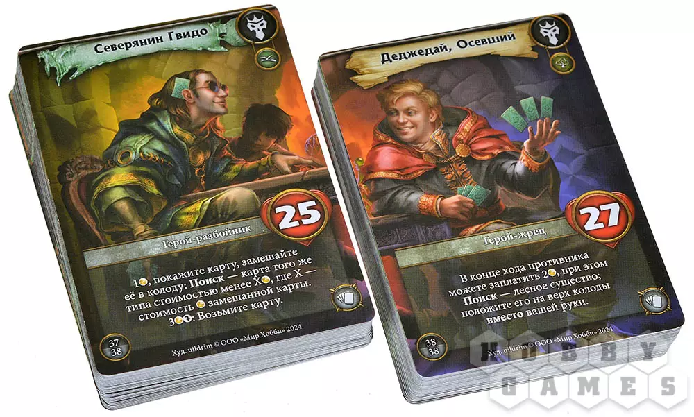 Весь игровой процесс, как вы уже поняли, строится на картах. В своей колоде Вы должны иметь одну карту героя, которая является Вашим альтер эго в игре, обладает определённым запасом жизни, способностью и стихией. Всего стихий пять: степи, горы, лес, болота, тьма. Карты без стихии – нейтральные. Помимо карты героя, в колоде Вы можете иметь от 40 карт той стихии, к которой принадлежит Ваш герой, но не более трёх копий одной и той же карты.