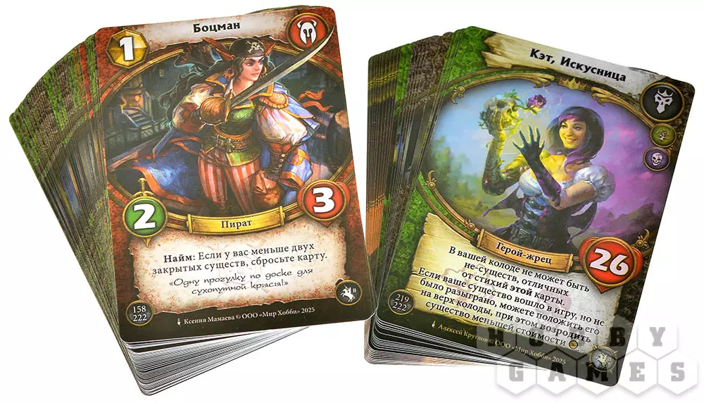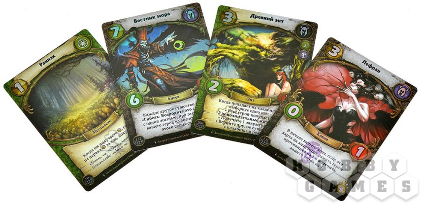 Весь игровой процесс, как вы уже поняли, строится на картах. В своей колоде Вы должны иметь одну карту героя, которая является Вашим альтер эго в игре, обладает определённым запасом жизни, способностью и стихией. Всего стихий пять: степи, горы, лес, болота, тьма. Карты без стихии – нейтральные. Обычно помимо карты героя, в колоде Вы можете иметь от 40 карт той стихии, к которой принадлежит Ваш герой, но не более трёх копий одной и той же карты. В формате Генерал ограничения на сбор колоды другие – в вашей колоде должно быть 60 неповторяющихся карт (кроме карт с Ордой, их по-прежнему может быть до 5 копий).