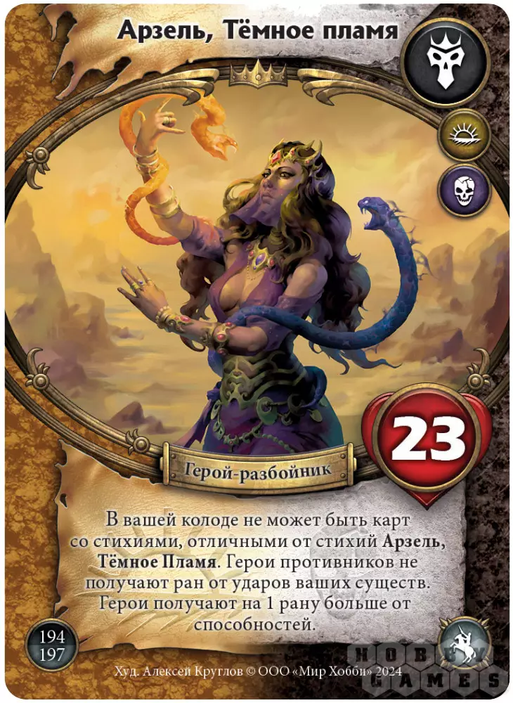 Весь игровой процесс, как вы уже поняли, строится на картах. В своей колоде Вы должны иметь одну карту героя, которая является Вашим альтер эго в игре, обладает определённым запасом жизни, способностью и стихией. Всего стихий пять: степи, горы, лес, болота, тьма. Карты без стихии – нейтральные. Обычно помимо карты героя, в колоде Вы можете иметь от 40 карт той стихии, к которой принадлежит Ваш герой, но не более трёх копий одной и той же карты. В формате Генерал ограничения на сбор колоды другие – в вашей колоде должно быть 60 неповторяющихся карт (кроме карт с Ордой, их по-прежнему может быть до 5 копий).