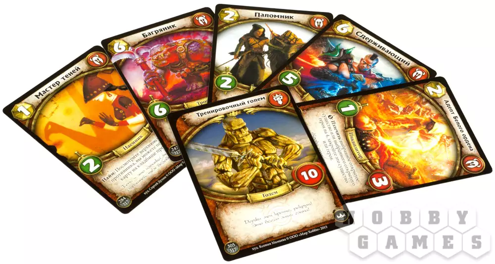 Весь игровой процесс, как вы уже поняли, строится на картах. В своей колоде вы должны иметь одну карту героя, которая является вашим альтер эго в игре, обладает определённым запасом жизни, способностью и стихией. Всего стихий пять: степи, горы, лес, болота, тьма. Карты без стихии – нейтральные. Помимо карты героя, в колоде вы можете иметь от 40 карт той стихии, к которой принадлежит ваш герой, но не более трёх копий одной и той же карты.
