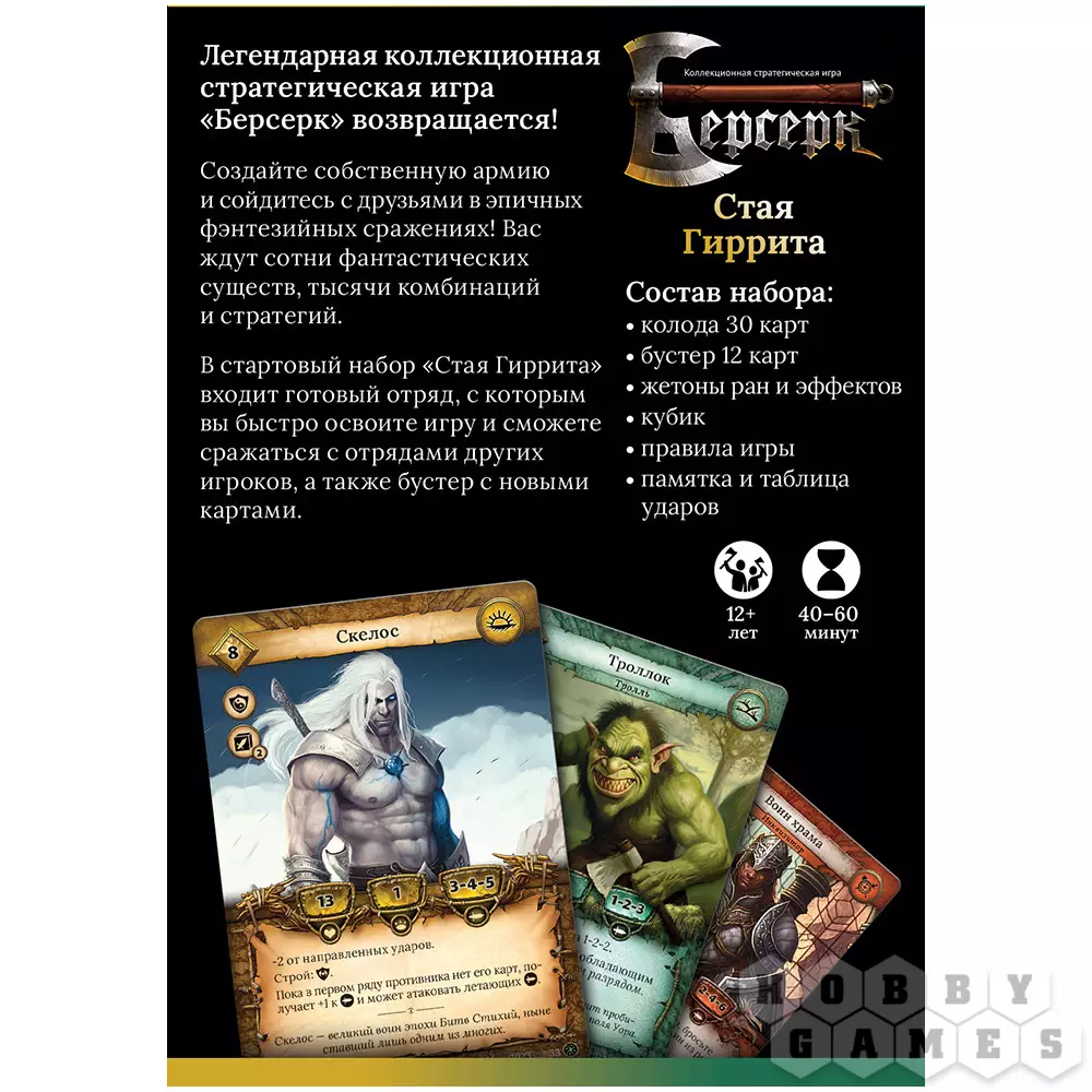Стартовый набор содержит всё необходимое, чтобы быстро войти в игру, будь вы фанатом классики или новичком в мире "Берсерка"! Внутри вы найдёте готовую колоду "Стая Гиррита" из 30 карт и бустер с 12 картами: более чем достаточно, чтобы вступить в бой полностью подготовленным!