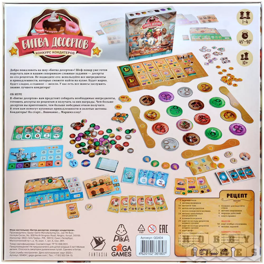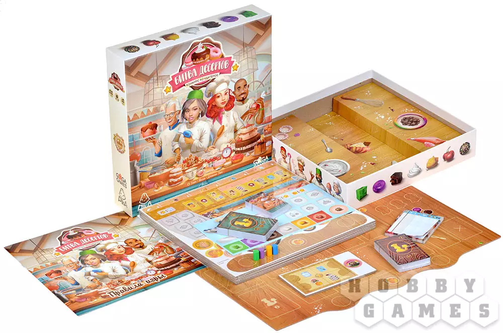 "Битва десертов: Конкурс кондитеров" – это семейная настольная игра, в которой вы примерите на себя роль кондитеров. Вашей задаче будет приготовление десертов, и чем их будет больше, тем выше ваши шансы на победу, ведь каждый завершённый рецепт приносит вам победные очки. У каждого игрока есть личный планшет, представляющий стол для готовки. На нём хранятся выбранные вами ингредиенты, которые вы будете использовать для приготовления десертов. Но их количество будет ограничено, ведь нельзя же занимать ими всю рабочую область! Подходите к выбору составляющих с умом, чтобы вам точно хватило на десерт и не осталось излишков – зачем им занимать ваше рабочее место?