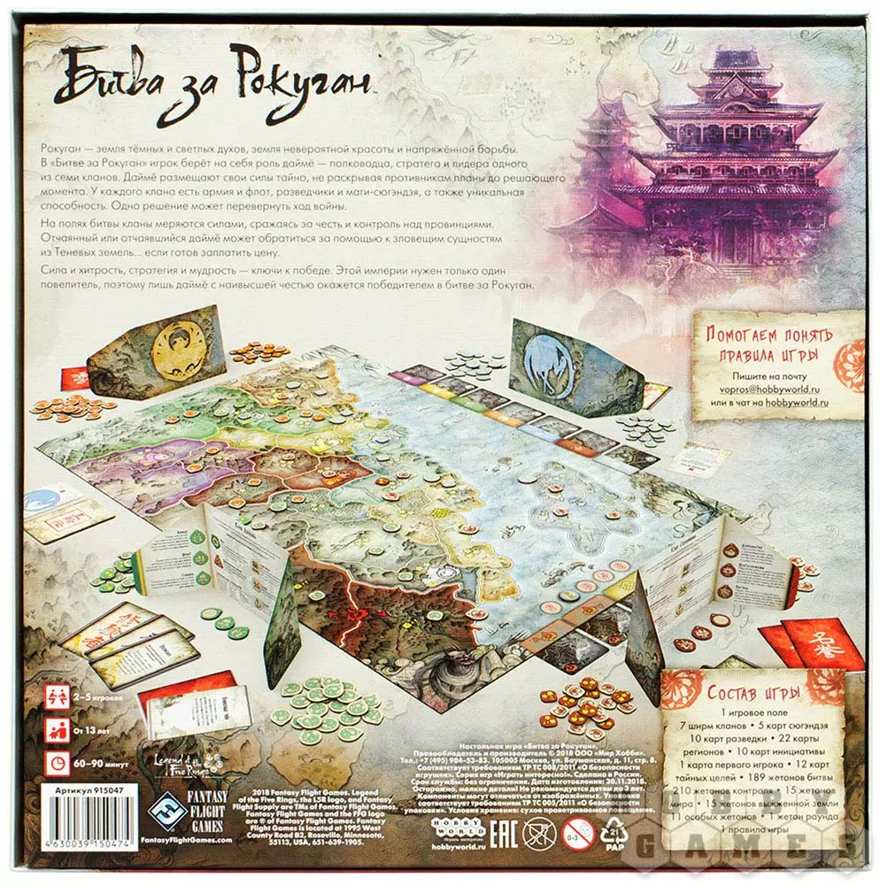 "Битва за Рокуган" – стратегическая военная игра про захват и контроль территорий в японском сеттинге для 2-5 игроков. Игроки берут на себя роли даймё (полководцами) Великих Кланов и ведут войны за землю Рокуган – древнюю землю, которая помнит множество битв и силу божественных духов. Вам предстоит предугадывать действия соперников и принимать грамотные решения. Игроки используют свои армии, флот, ловких синоби, дипломатию и другие трюки, чтобы захватывать провинции, оборонять их от посягательств враждебных кланов, и, конечно, заработать как можно больше чести. Грядут великие сражения, армии будут сталкиваться вновь и вновь, таинственная магия ками обрушится на врагов. Но помните – в живых останется лишь один даймё!