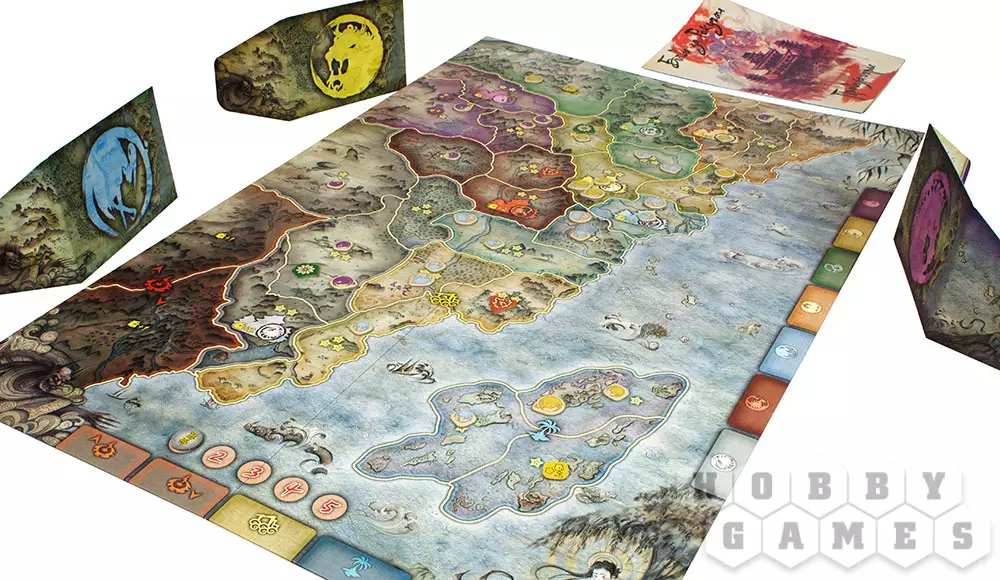 Вся игра проходит на большом игровом поле, поделённом на регионы и провинции, за которые и будет идти борьба. Каждый игрок берёт под свой контроль один из семи кланов, каждый из которых обладает уникальными особенностями и начинает игру со своей персональной столицей в одном из регионов. Помимо этого каждый игрок обладает фирменной ширмой, чтобы скрыть все свои действия от неприятеля, и картой тайной цели.