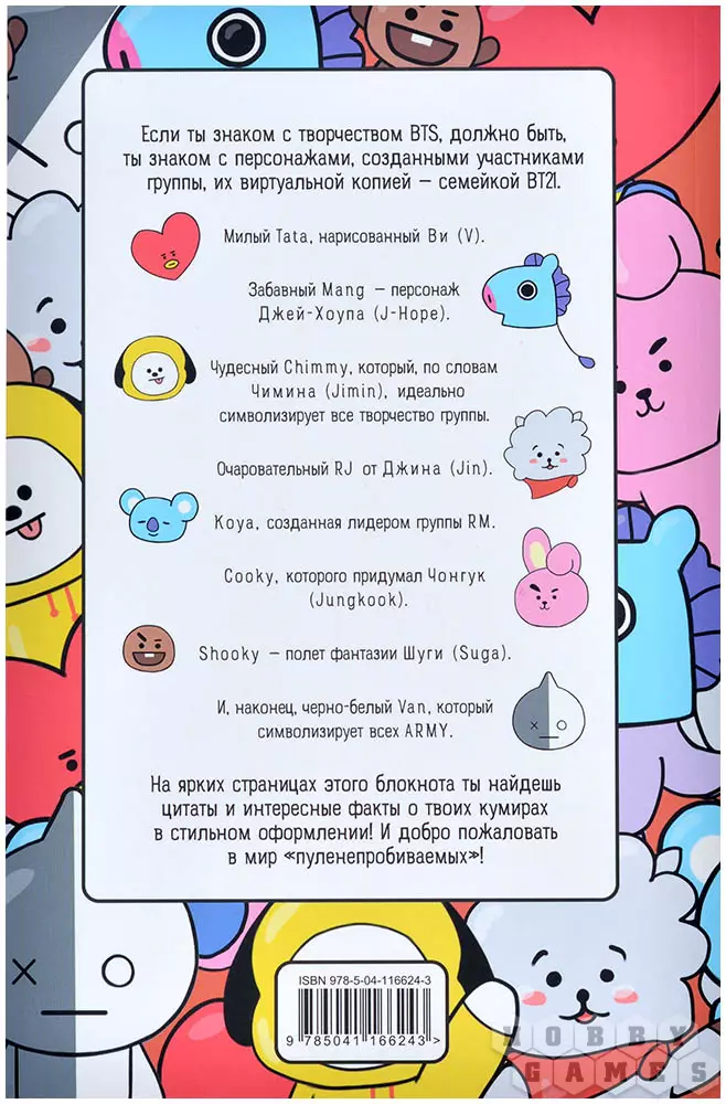 BTS – легендарная k-pop группа, ставшая одним из символов Южной Кореи. Они обладают толпами фанатов по всему миру, получают престижные премии и неустанно экспериментируют со стилем. Если вы тоже поклонник или поклонница BTS, этот блокнот просто создан для вас! Творите, записывайте в него свои самые смелые идеи, делайте наброски – удобный формат и качественная бумага делают блокнот универсальным аксессуаром.
