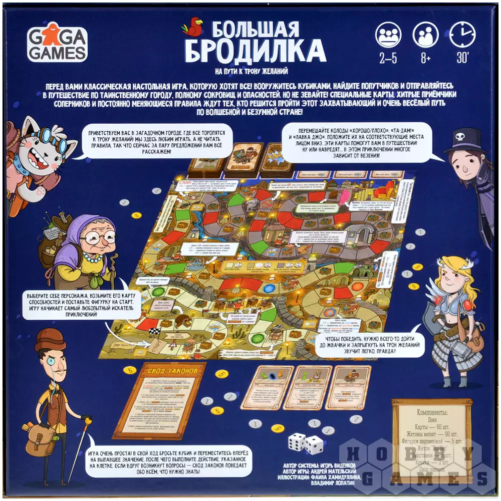 "На пути к трону желаний" – это новая самостоятельная часть знакомой многим настольной гонки "Большая бродилка"! Если вам наскучило вести своего персонажа одной и той же дорогой, а карточки из лавки Джо больше не удивляют, то эта коробка станет вашим спасением! Во-первых, в игре новая карта. Извилистый маршрут со своими ловушками и хитростями не даст вам заскучать. Во-вторых, в комплекте целая куча новых карт: сундуки, "Та-Дам" и "Лавка Джо" удивят и вас, и ваших оппонентов. И, в-третьих, у каждого героя теперь есть свои уникальные способности! Но самое главное, что при всех нововведениях игровой процесс остался всё таким же простым и весёлым! Отправьтесь в новое захватывающее приключение со своими друзьями!