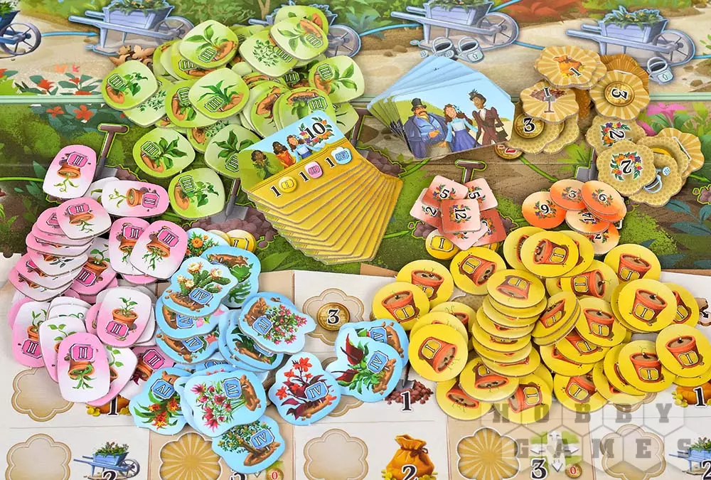 Три этапа игры раскрываются как лепестки цветка. В первом раунде вы закладываете основу своего сада. Когда все участники доходят до края поля, начинается второй раунд – перевёрнутые жетоны действий открывают новые возможности. Финальный этап – это последний шанс проявить мастерство, продвигаясь по счётчикам для получения решающих очков.