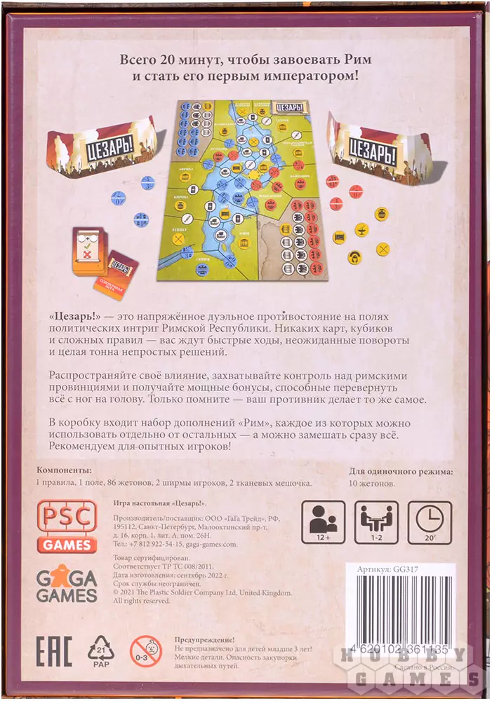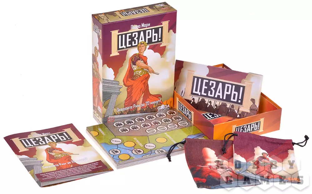 Несмотря на название игры, ответ неоднозначен – ведь в этой дуэльной стратегии один из игроков возьмёт роль Гая Цезаря, а другой – Гнея Помпея. Игра "Цезарь!" посвящена политическому и военному противостоянию, но отличается простыми правилами и динамичными ходами – что постоянно побуждает игроков принимать важные решения. Каждый ход ситуация на поле может измениться, а потому нельзя терять бдительность! По очереди игроки выкладывают жетоны влияния на границы регионов – тот, кто обладает в отдельно взятой провинции наибольшим влиянием, кладёт туда свой жетон контроля. Победить в игре можно двумя способами – либо выложив все свои жетоны контроля, либо загнать оппонента в ситуацию, где он не может разместить жетон влияния. В таком случае вы выигрываете и становитесь, вероятно, первым диктатором Рима – к добру это или нет!