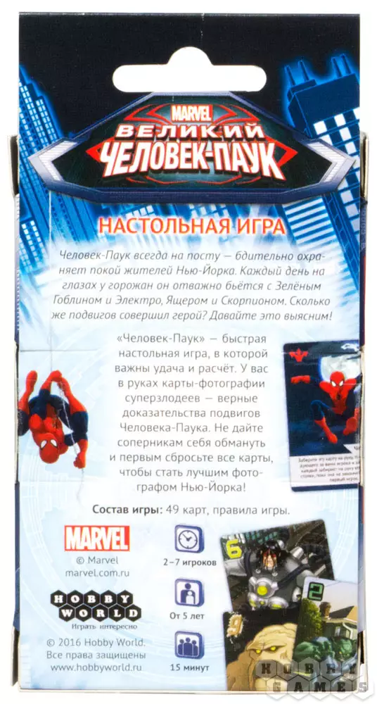 Настольная игра "Великий Человек-Паук" – это простая в освоении и динамичная настольная игра, в которой важны актёрское мастерство, расчёт, умение блефовать, считать и продумывать ходы. У вас на руках находятся карты-фотографии суперзлодеев – верные доказательства подвигов Человека-Паука. Именно вы должны сообщить городу о подвигах героя, причём так, чтобы здесь не было ни ошибок, ни недомолвок… Ни один геройский поступок не окажется забытым!
