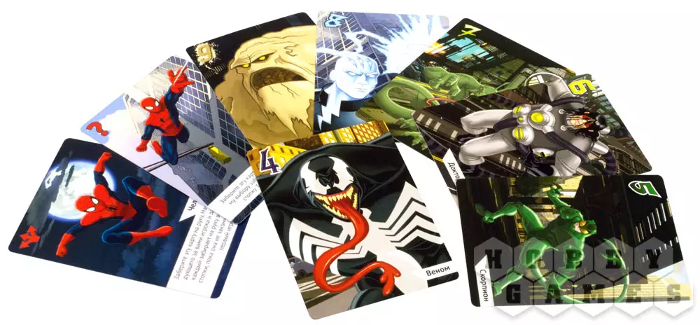 На начало партии карты раздаются поровну между всеми игроками и ваша главная задача – это избавиться от них. В свой ход вы можете выбрать от 1 до 4 карт с руки, выложить их на стол взакрытую и сообщить оппонентам, что вы видели, как Человек-Паук победил определённого злодея энное количество раз, ну, например, "Победил Венома три раза!". Нельзя загадывать разных злодеев или Человека-Паука, но при этом, конечно, вы можете выкладывать любые карты с руки, то есть блефовать. Следующий за вами игрок должен сделать свой выбор, верит ли он вам или хочет сделать уточнение.