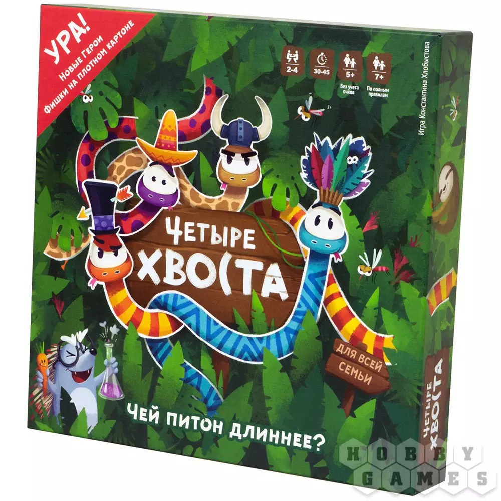 Задиристый Хью, весёлый Хосе, воинственный Жираф и добродушный Лионель – настоящие питоны, которые вылупились из волшебного яйца, найденного кладоискателями в джунглях Амазонки. В весёлой настольной игре "Четыре Хвоста" вам предстоит вырастить этих братьев до максимального размера.