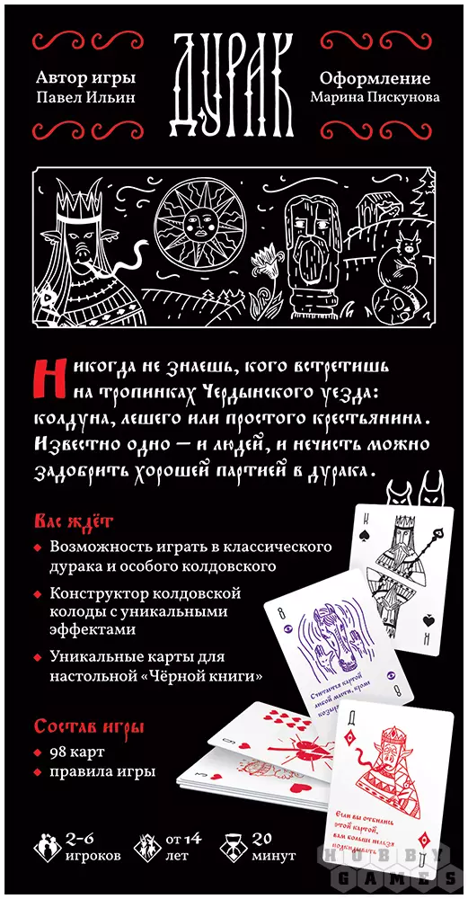 "Чёрная книга: Дурак" – это уникальная колдовская карточная игра, где классический дурак переплетается с магией. Освойте правила переводного дурака и откройте для себя заколдованные нечистью карты с их магическими эффектами. Ваши руки развязаны – выбирайте, как и с кем играть, но никогда не забывайте: как бы ни были плохи дела, а душой рисковать не стоит! Вас ждут уникальные возможности: конструирование колдовской колоды с особыми эффектами и возможность сыграть в особый колдовской вариант классического дурака. Станьте мастером карточных игр, но будьте осторожны – на этих тропинках не всё так просто!