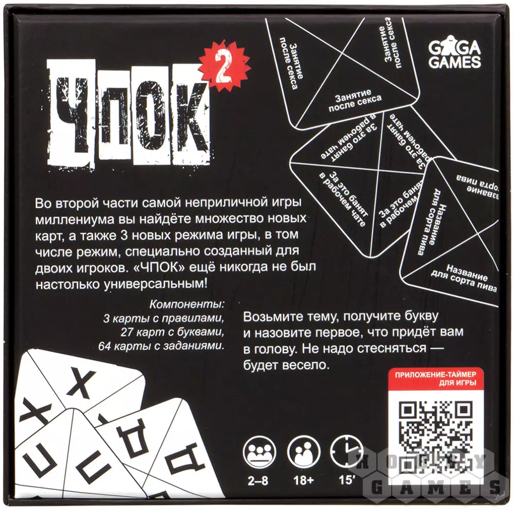 Если вам мало "Чпока" – встречайте "Чпок 2"! Несложно догадаться, что эта вторая игра в серии, в которой также в два раза больше бесстыдства и дикого смеха. 64 темы, которые вы вряд ли подняли бы в обычном общении со своими друзьями, помогут вам узнать их с новой, неожиданной стороны (главное быть осторожным, чтобы потом не пожалеть об обретённом знании). Новые режимы и карточки тем даст вам основу для троллинга на несколько лет вперёд!