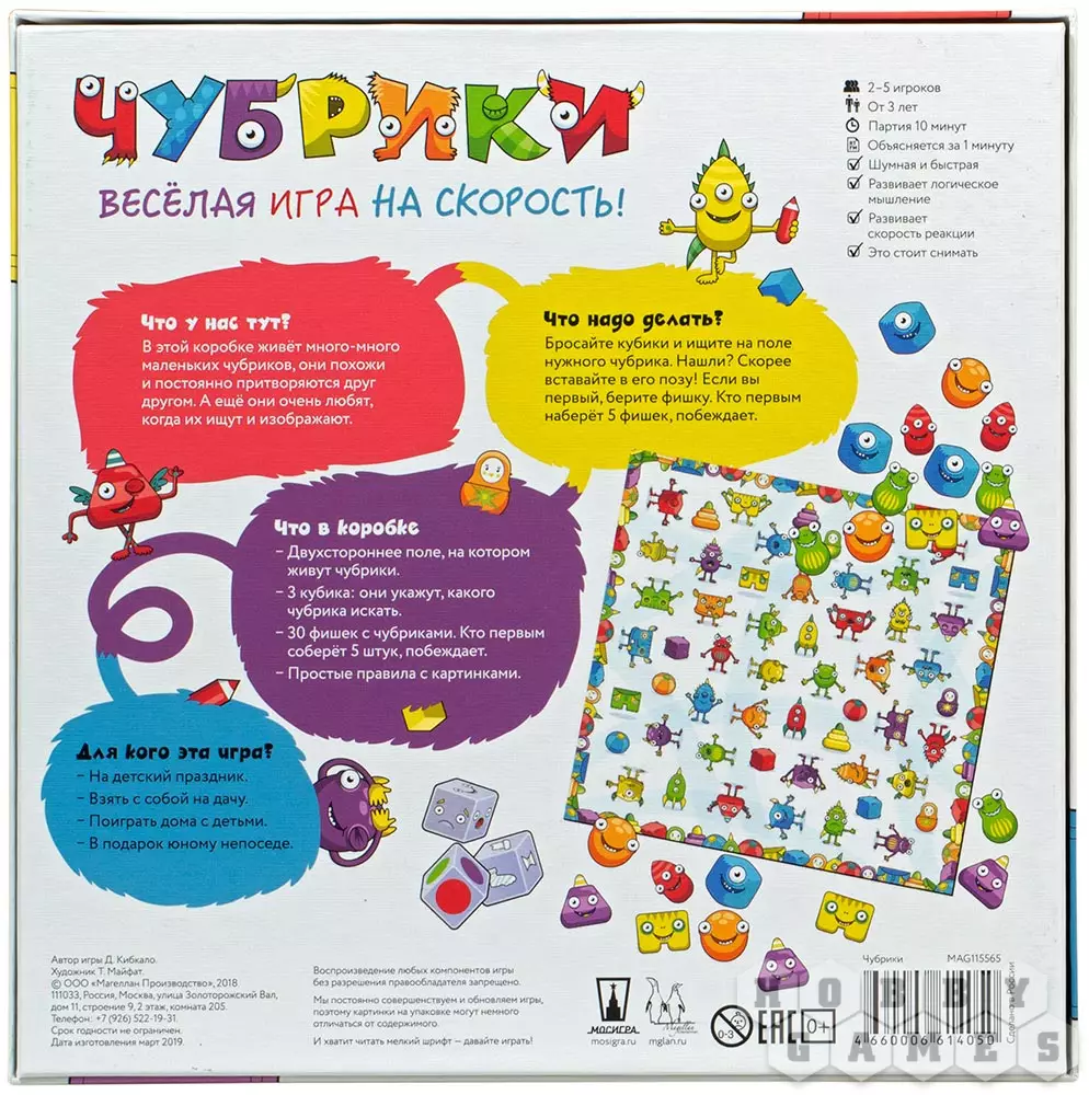 В этой настольной игре перед вами будет красочное поле: вам предстоит бросать кубик и разыскивать на этом поле нужного вам чубрика. Как только вы его отыщите, нужно будет поскорее принять именно ту позу, которую он изображает. В случае успеха вы сможете заработать себе призовую фишку, а если вы сможете первым набрать 5 таких фишек – станете победителем игры. Эта настолка отлично подходит для организации весёлого досуга с детьми, её очень удобно взять с собой в гости или на дачу.