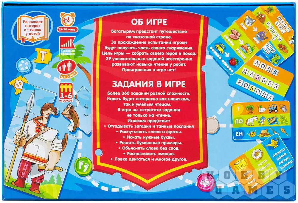 Соберите богатырей в "чумачечее" приключение в волшебную страну! Настольная игра "Чумачечий квест" специально разработана для развития речи и навыков чтения дошкольников и учеников младших начальных классов. Внутри вас ожидает свыше 360 игровых испытаний разного уровня сложности, за выполнение которых чтецы получают элементы снаряжения для своих богатырей. Задача каждого из игроков – собрать витязя в поход.