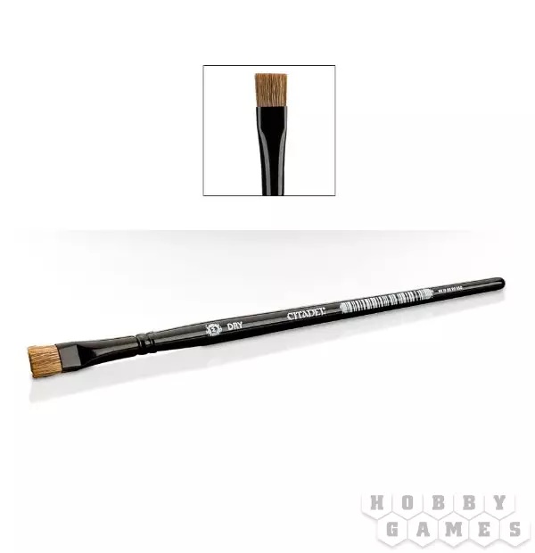 Эта средняя по размеру кисточка состоит из комбинации синтетических волосинок и волосинок волов, специально, чтобы повышения жёсткости и прочности кисти. Плоский профиль позволит равномерно покрывать поверхности модели на различной высоте — что очень важно при сухой покраске.