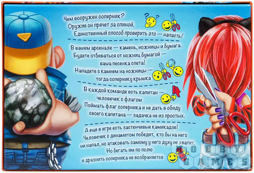 У каждого из игроков в распоряжении имеется команда, каждый боец которой сжимает за спиной предмет известной нам с детства игры "камень-ножницы-бумага". Один персонаж, у которого за спиной красный флажок, является капитаном вашей команды, его-то и нужно будет защищать всеми возможными способами, а заодно вычислить капитана команды противника.