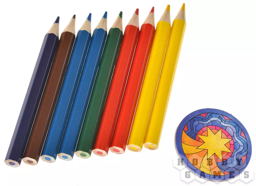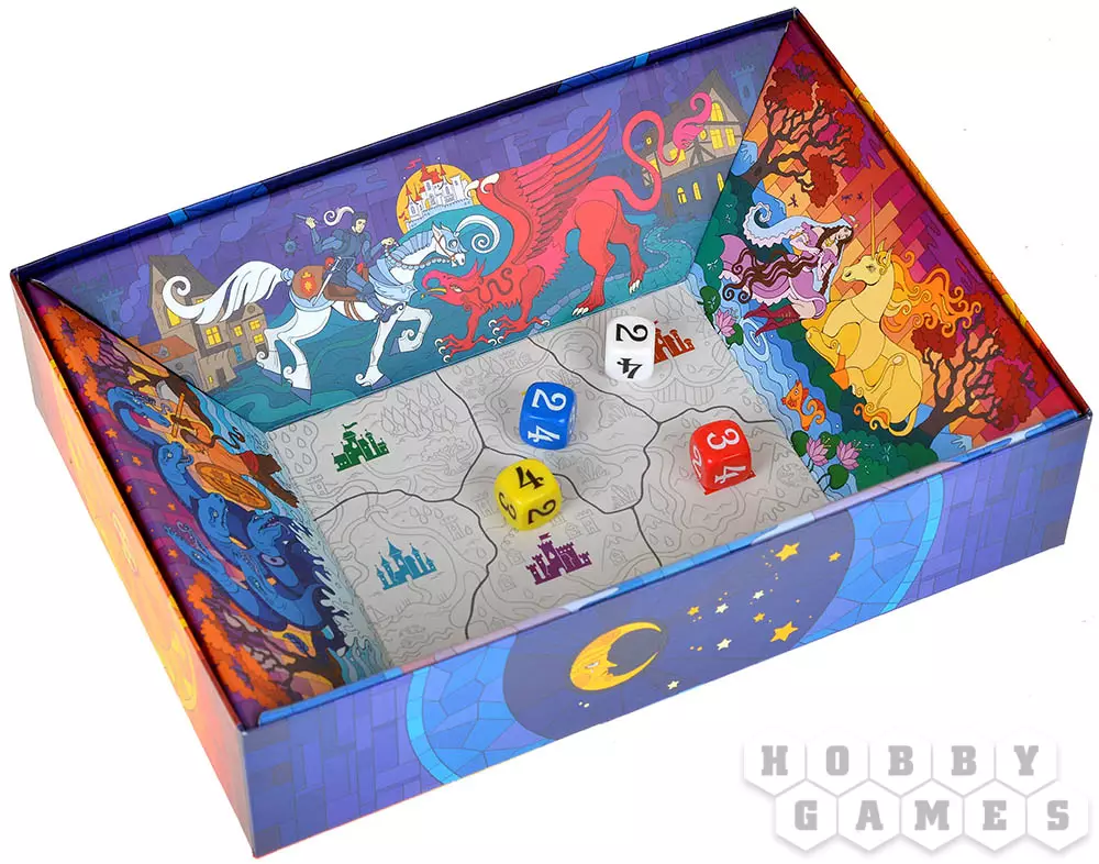 Игровое поле встроено прямо в коробку, так что, бросая кубики, вам не придётся переживать, что они разлетятся во все стороны. Раскрашивать королевства на своей карте – сплошное удовольствие, тем более, что яркие карандаши уже идут в комплекте. Продумывайте ходы, чтобы создать редкие составные цвета и набрать как можно больше победных очков и вернуть королевствам былую славу!