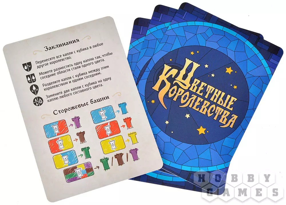 В начале раунда бросьте кубики на карту королевств – они определят, куда упали капли и какого они цвета. Выбирайте кубик и закрашивайте области на своём листе, используя базовые цвета (синий, красный, жёлтый) или создавая составные (фиолетовый, зелёный, коричневый). Закрашивайте столицы, чтобы получить дополнительные очки, побеждайте или приручайте чудовищ, используйте заклинания для нестандартных ходов и смешивайте краски в сторожевых башнях. Каждый раунд – это новые возможности и выбор: будете ли вы действовать быстро, чтобы опередить соперников, или копить ресурсы для мощного финального рывка?