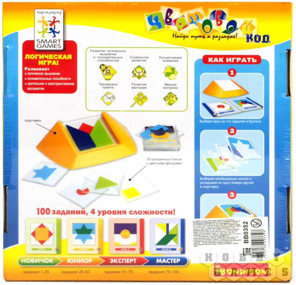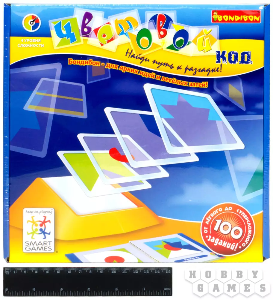 Логическая игра "Цветовой код" от Bondibon – просто взрыв красок! Весь мир насыщен разнообразными цветами и сотнями их оттенков, а многие из них являются таинственным зашифрованным кодом, читать который мы учимся всю жизнь. Зеленый - цвет летней травы и листвы деревьев, желтый – цвет солнца и радости, красный – цвет тюльпанов и маминой помады. Наша настольная игра "Цветовой код" поможет не заблудиться в цветовом разнообразии жизни! Увлекательная игра-головоломка для взрослых и детей с огромным количеством вариантов заданий. Нужно сложить плитки таким образом, чтобы воспроизвести композицию из карточки с выбранным заданием. При решении поставленной задачи надо правильно скомбинировать цвета, формы и последовательность расположения плиток. Правильно выполнить задание поможет внимание, логика и терпение. Рекомендуем играть в «Цветовой код» от Бондибон вместе с детьми. Логические игры - прекрасный способ весело и с пользой провести свободное время с ребенком!