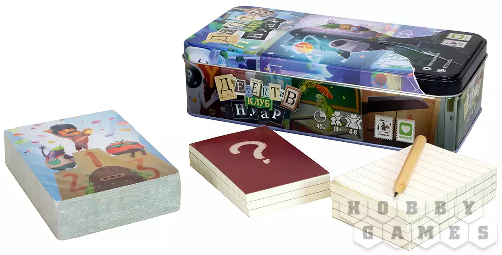 "Детектив Клуб: Нуар" – это дополнительные 84 карты для настольной игры "Детектив Клуб". Новые карты доказательств помогут вам ещё лучше зашифровывать свои "ключи" и вычислять конспиратора. Иллюстрации на картах, конечно, не такие нуарные, как могут показаться и как гласит название дополнения, но вариантов для загадывания "мрачных" шифров более чем предостаточно!