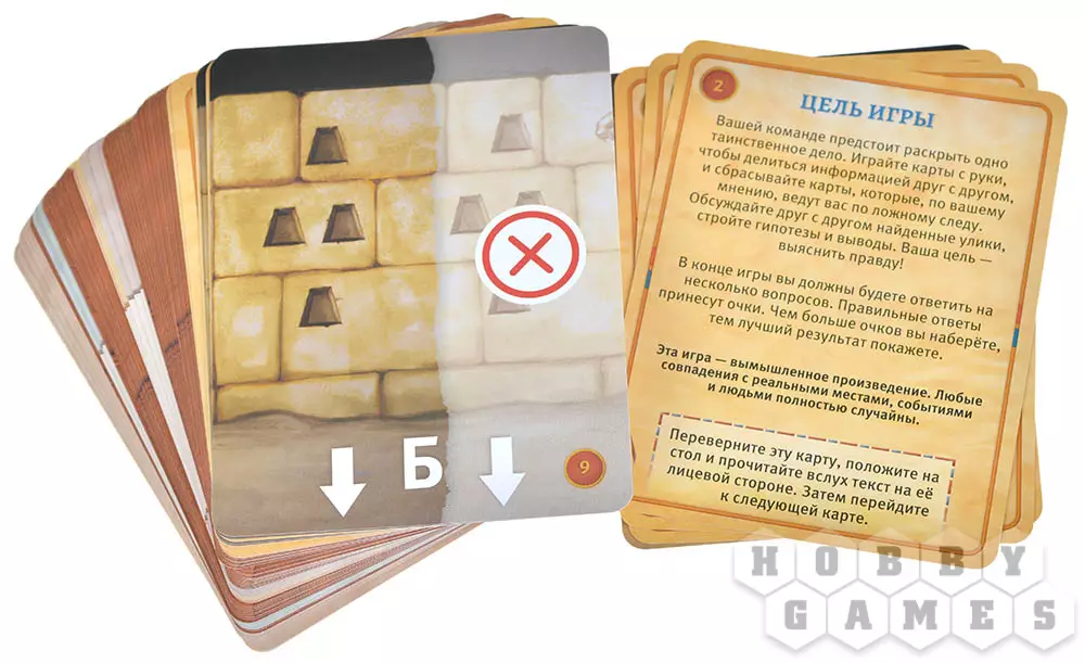 Колода карт расследования кладётся в центре игрового стола. Карты в колоде нельзя перемешивать и подсматривать, игра начинается с верхней карты. Прочитайте текст на первой карте. В начале игры участники соберут из коробки объёмное место преступления, а далее игра сама расскажет вам, что делать дальше, и в какой последовательности.