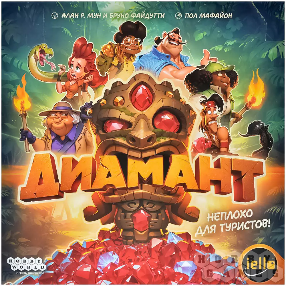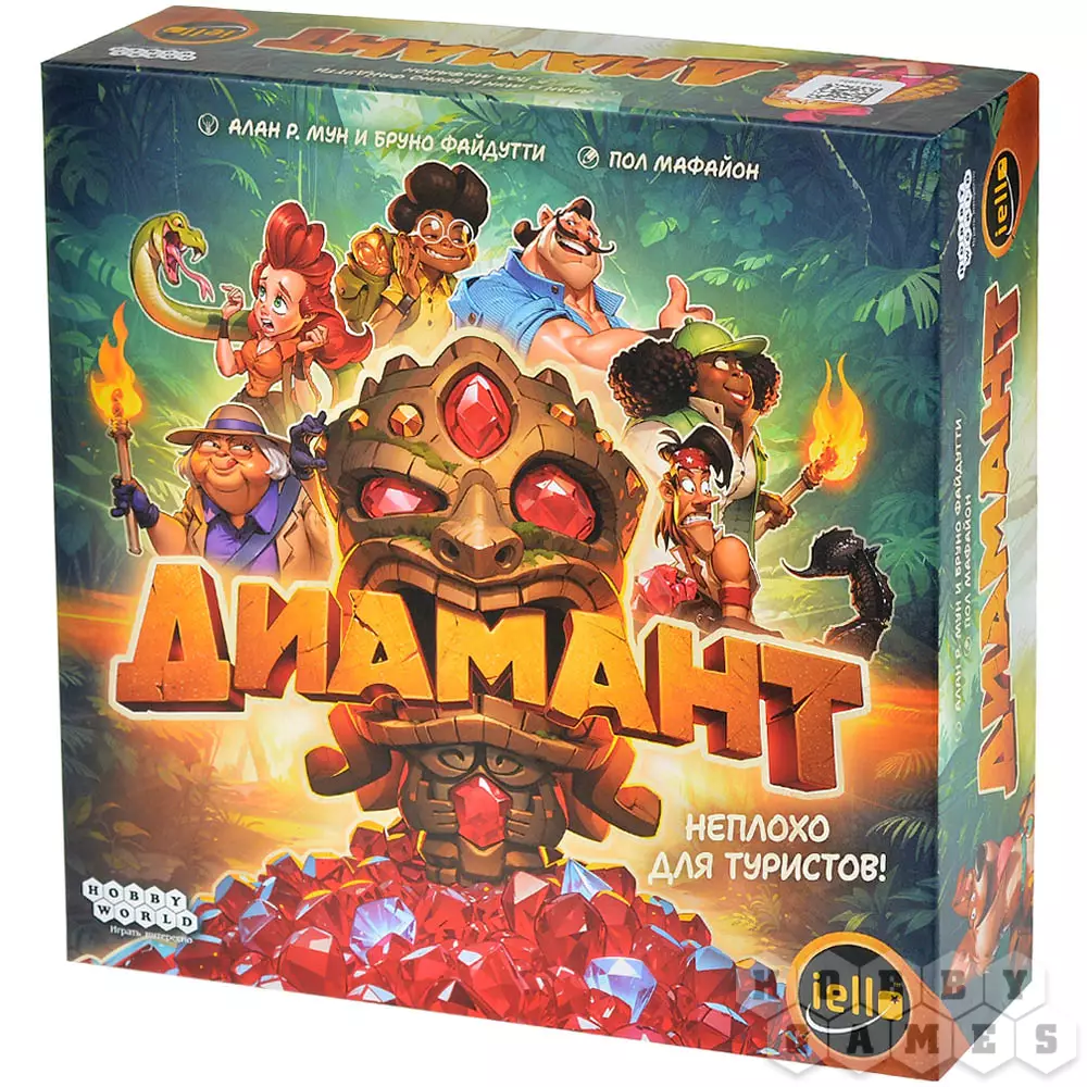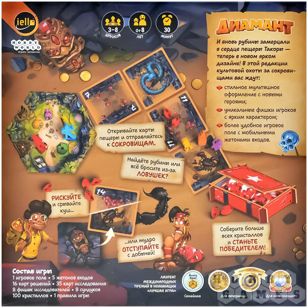 "Диамант" – это динамичная семейная настольная игра про риск и жадность, получившая новое яркое оформление. Вас ждут стильный мультяшный дизайн, харизматичные персонажи и удобное поле с подвижными жетонами входов в пещеру. Игра идеально подойдёт для семьи, компании друзей и вечеринок, легко объясняется новичкам и при этом каждый раз создаёт новые напряжённые ситуации за столом. Неоднократный лауреат международных премий и заслуженно считается одной из лучших игр для знакомства с настольным хобби.