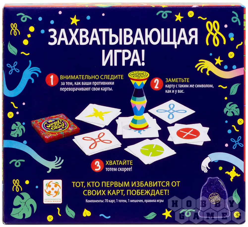 Если вы решитесь купить настольную игру "Дикие джунгли", то в комплекте получите 80 штук игровых карточек, оформленных в оригинальном этническом дизайне, деревянный "тотем". Колода перед началом раунда делится между всеми участниками поровну. По правилам игры, все карты укладываются "рубашками" вверх, чтобы сами игроки посмотреть свои резервы не смогли. Как только в центре стола окажется "тотем", можно стартовать. Цель настольной игры "Дикие джунгли (Jungle Speed)" – избавиться как можно быстрее от имеющихся карт, выигрывая со своими противниками дуэли. Каждый из участников в процессе игры переворачивает по очереди карту их своего набора, кладет её рядом. Открывается карта "от себя", так, чтобы её первыми увидели другие игроки. Сразу, как на столе у двух игроков оказались открыты карты с теми же символами – дуэль. Сражение завершается в пользу схватившего тотем первым.