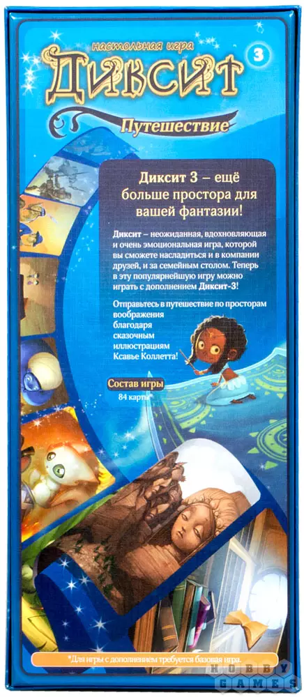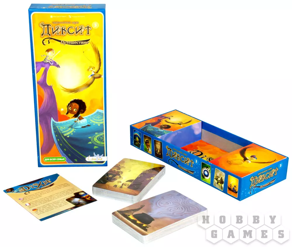 "Диксит 3. Путешествие" – это дополнение к настольной игре "Диксит" и "Диксит Одиссея". Эта колода привносит в эту удивительную игры свежие образы и ассоциации, делая процесс игры еще разнообразнее и интереснее. В этой колоде представлены новые карты в количестве 81 штуки, на которых изображены фантастические и сюрреалистические произведения художественного искусства. В новой версии дополнения, коробка стала меньше и удобнее для путешествий.
