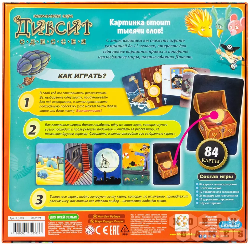 Настольная игра "Диксит Одиссея" раскрывает новые секреты магии "Диксит", одной из самых необычных игр за последние годы. Разгадайте тайны иллюстраций, обойдите ловушки, устроенные оппонентами и дайте волю своему воображению! С этим изданием вы сможете играть компанией до 12 человек. Откройте для себя новые варианты правил и покорите неизвестные, полные обаяния миры Диксит.