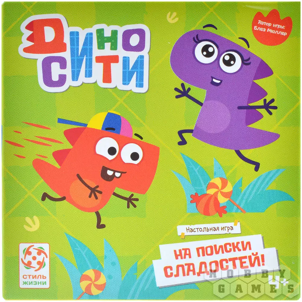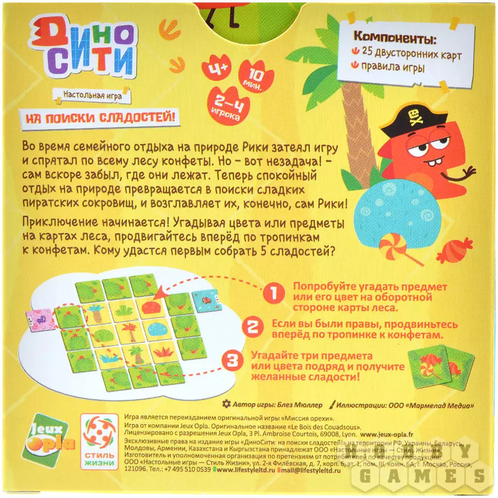 "Дино Сити: На поиски сладостей!" – это занимательная детская настольная игра на память с очень простыми правилами. Разложите карты леса в центре стола, чтобы получилась сетка поля размером 3x3. Затем с каждой стороны получившегося квадрата выложите по 3 карты конфет. Игроки кладут свою карту завра на одной из сторон получившегося поля и стараются пройти по прямой тропинке к противоположной стороне, чтобы получить карту конфеты. А сделать это можно только угадав, что изображено на обратной стороне карте леса. Угадали? Переходите к следующей карте. А если нет, то закройте карту, ход передаётся дальше. Запоминайте, что уже открывали! Так вам будет проще пройти по тропинке. Побеждает в игре тот сладкоежка, кто быстрее остальных соберёт 5 карт конфет.