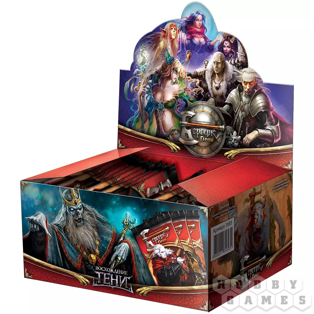 Перед вами дисплей — набор бустеров из четвёртого набора карт «Восхождение Тени» к коллекционной карточной игре «Берсерк. Герои». Всего в этом дисплее вы найдёте 24 бустера, открыв которые, вы получите целых 360 карт!