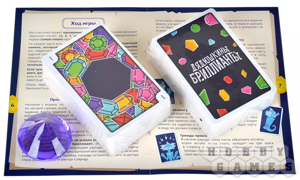 Весь следующий раунд обладатель проклятого бриллианта обязан выполнять задание, которое написано в карте проклятий. По итогам 5 раундов участники игры подсчитывают очки и объявляют победителя в этой гонке драгоценностей. Игра подходит для всех возрастов, не требует долгой подготовки, является хорошей разминкой для ума и тела.