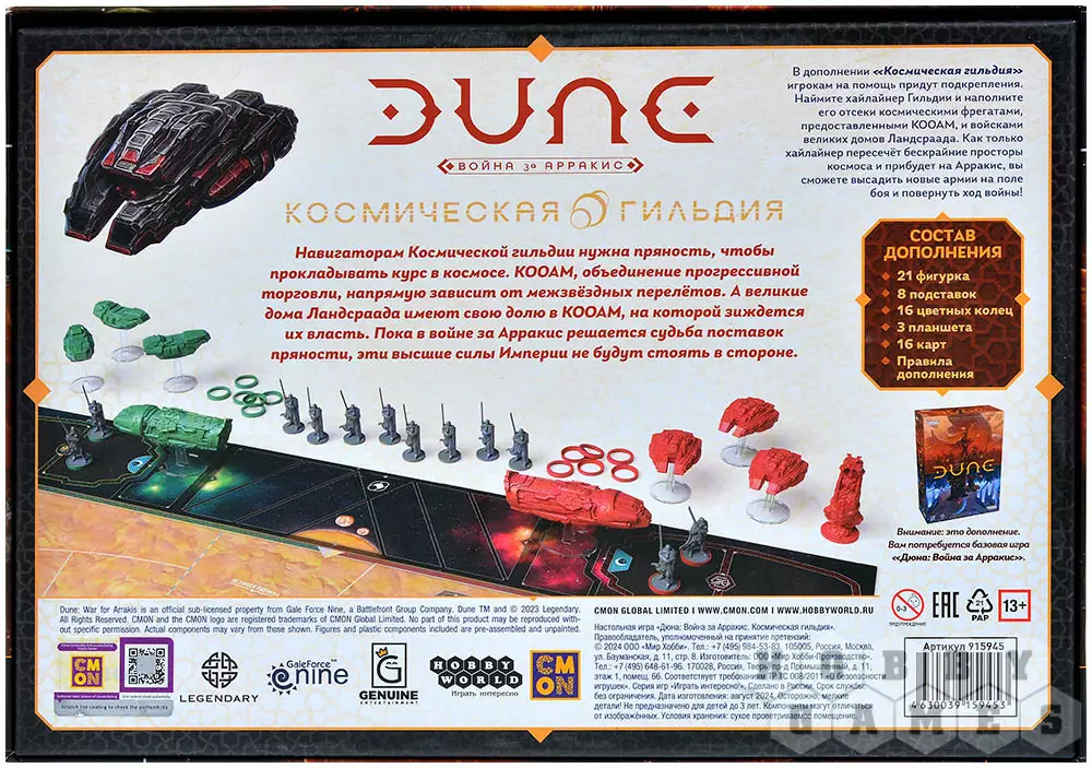 "Космическая гильдия" – это дополнение к стратегической настольной игре "Дюна: Война за Арракис". Теперь в вашем распоряжении появится ещё один очень важный актив, который позволит усовершенствовать стратегию и продумать новые тактические повороты. Вы сможете воспользоваться хайлайнерами, позволяющими перемещать легионы на куда большие расстояния, а также воззвать к помощи великих домов. Теперь и так не угасающий конфликт разгорится с новой силой, увлекая вас в мир ожесточённого планирования.