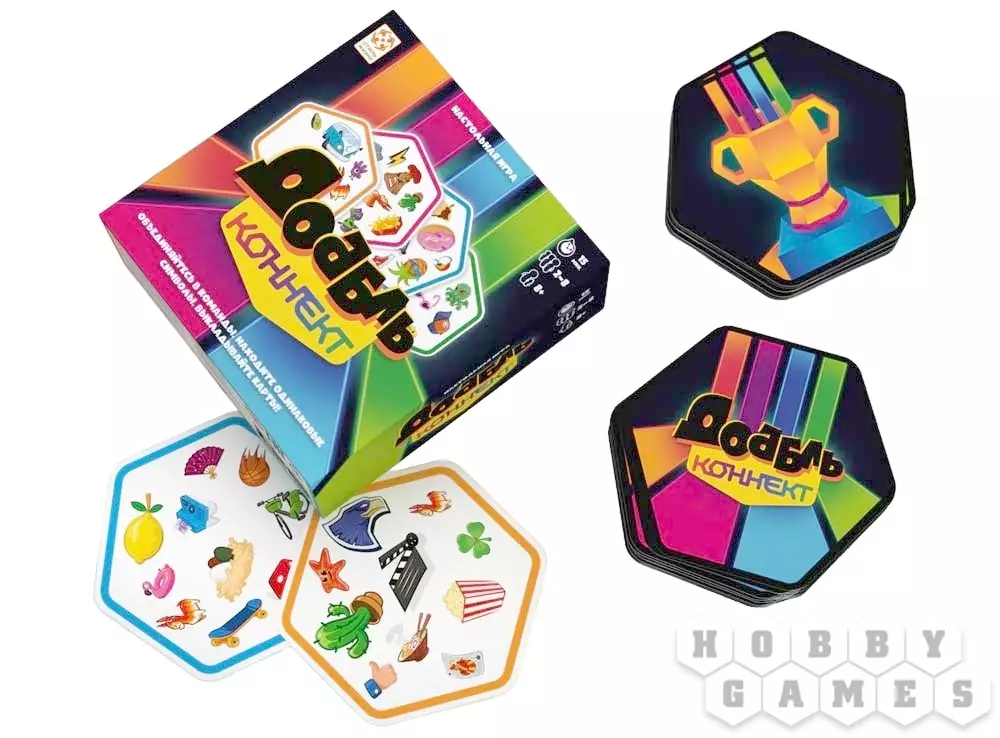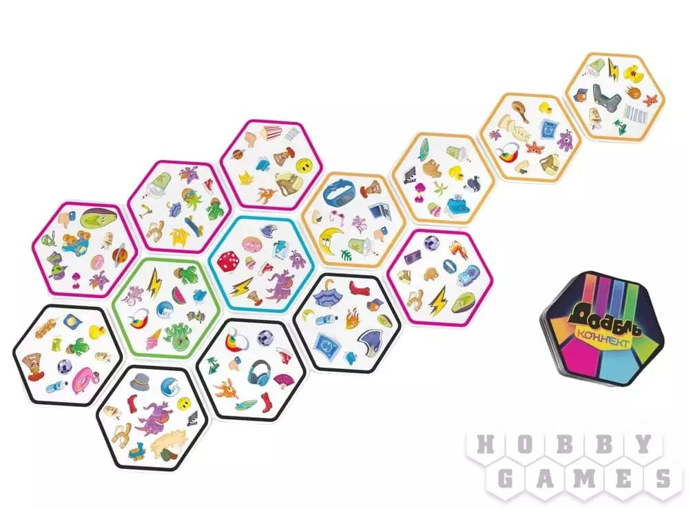"Доббль: Коннект" – это увлекательная игра, требующая быстрой реакции и внимательности. Вы можете играть как в команде, так и в одиночку, но принцип остаётся прежним – найти совпадение на двух карточках быстрее всех. Постарайтесь выложить 4 карты своего цвета в ряд, чтобы одержать победу в раунде. И самое интересное, что в "Доббль: Коннект" творится полный хаос, отсуствует очередность ходов, все игроки действуют одновременно!